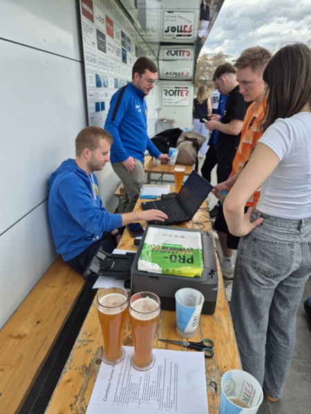 Rushhour bei der Turnierleitung nach den Spielen – Patrick Schürz und Jonas Hofmann waren aber mit Getränken bestens versorgt und meisterten ihre Aufgaben bravourös