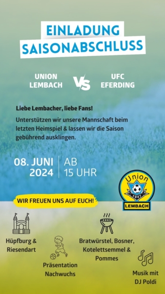 Gespielt wird am Samstag, 8. Juni 2024 um 15:00 Uhr (Reserve) + 17:00 (KM). Falls es das Wetter und die Platzverhältnisse zulassen, bestreiten unsere Damen im Anschluss um ca. 19:00 Uhr noch ein Testspiel gegen ASKÖ Neue Heimat. Im Rahmen dieser Spiele findet auch wieder die offizielle Saisonabschlussfeier mit einem bunten Rahmenprogramm statt. Neben einer Präsentation unserer Nachwuchsmannschaften dürfen sich die Kinder über eine Hüpfburg und das beliebte Fußball-Riesendart freuen. Kulinarisch gibt es neben den altbekannten Klassikern Bosner, Bratwürstel und Kotelettsemmeln am Samstag auch Pommes für alle Hungrigen. Nach den Spielen sorgt DJ Poldi noch für gute Stimmung bei allen Besucherinnen und Besuchern. Wir freuen uns über viele Fans beim letzten Saisonspiel!