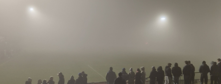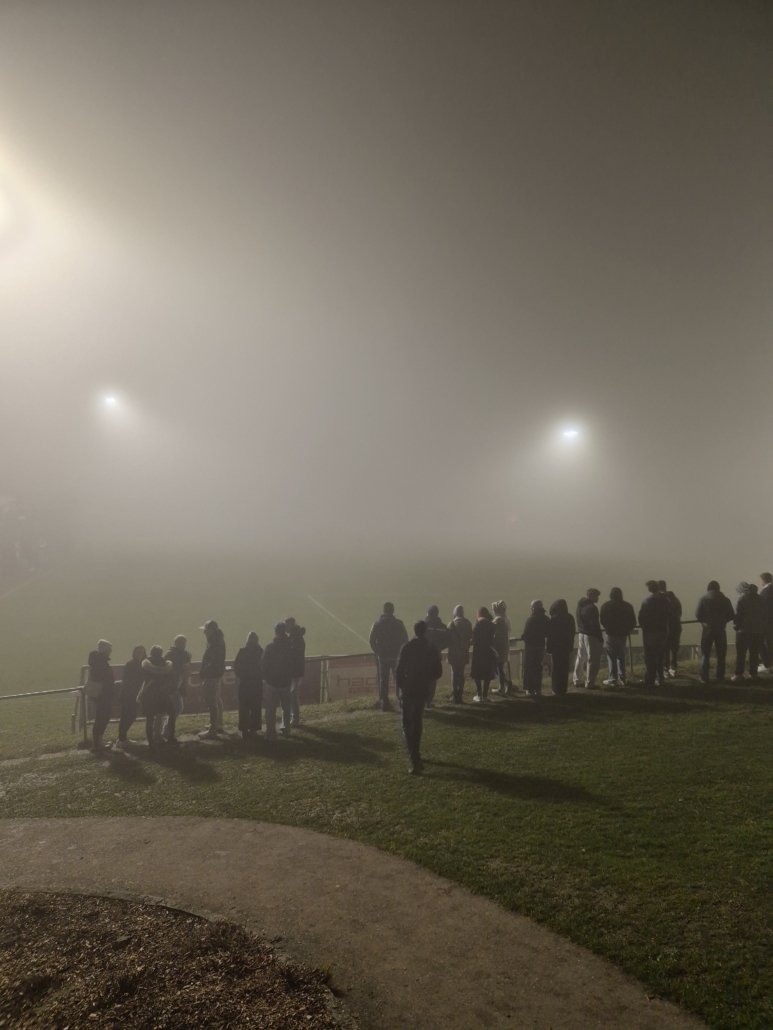 Wechsel zur Pause gab es auf unserer Seite keine, allerdings wäre bei einigen Tribünenbesuchern ein Kleiderwechsel sinnvoll gewesen, durch die vielen Bengalos sahen viele Fans wie Bewohnerinnen und Bewohner von Schlumpfhausen aus, einige Altenfeldner Fans aus dem Fanclub waren zudem noch aus flüssigen Gründen bereits relativ „blau“. In den ersten zehn Minuten gab es noch wenig Abschlüsse, erwähnenswert nur ein Schuss von Laura Schinkinger nach einer Ecke, den Ball hat Elisa Hofbauer aber ohne Probleme. Die Sicht wurde aufgrund des Nebels im Laufe der zweiten Hälfte immer schlechter und so bitte ich die in der Folge teilweise unpräzise Beschreibung der Chancen und Tore zu entschuldigen, von der Tribüne aus sah man fast nur mehr eine weiße Wand mit sich bewegenden Punkten. In Minute 55 schickt Mimi Höglinger Flora Reitetschläger, der Ball wird irgendwie im Nebel geklärt. Zwei Minuten später war Schiedsrichter Fritz Erlinger zu erkennen als er Richtung Mittelkreis zeigt, Altenfelden führt in Minute 57, nach intensiven Analysen und Tatrekonstruktionen dürfte von rechts eine Flanke Richtung zweite Stange gekommen sein, die Claire Pröll über die Linie drückt (evtl. war es auch ganz anders, hier darf jeder seiner Kreativität freien Lauf lassen).