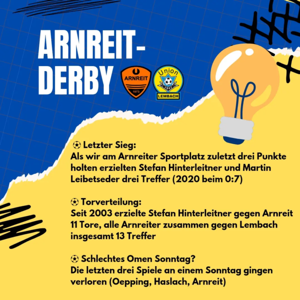 Für die Gastgeber aus Arnreit ist es das erste Derby der noch jungen Saison und ein Blick auf die vergangenen Heimspiele gegen unsere Mannschaft lässt das Selbstvertrauen der Schwarz-Orangen eher anwachsen, denn wir hatten zuletzt unsere Probleme am Arnreiter Sportplatz. Den letzten Sieg feierten wir im Oktober 2020 in der dann abgebrochenen Saison, danach folgten ein Unentschieden und zwei Niederlagen. Unsererseits ist das Selbstvertrauen aber nach dem Heimsieg gegen Hofkirchen auch groß und unsere Jungs werden sicher alles für den zweiten Derbysieg in Folge geben. Weitere Infos zum Duell gibt es auch für dieses Duell im Factsheet: